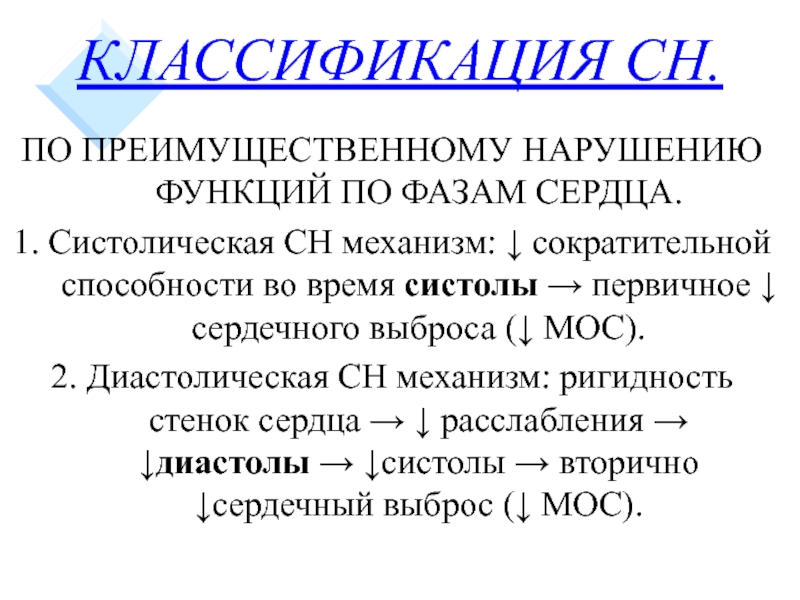 2. Диастолическая СН механизм: ригидность стенок сердца → ↓ расслабления → ↓диастолы → ↓систолы → вторично ↓сердечный выброс (↓ МОС).