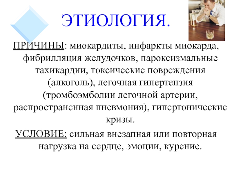(алкоголь), легочная гипертензия (тромбоэмболии легочной артерии, распространенная пневмония), гипертонические кризы.