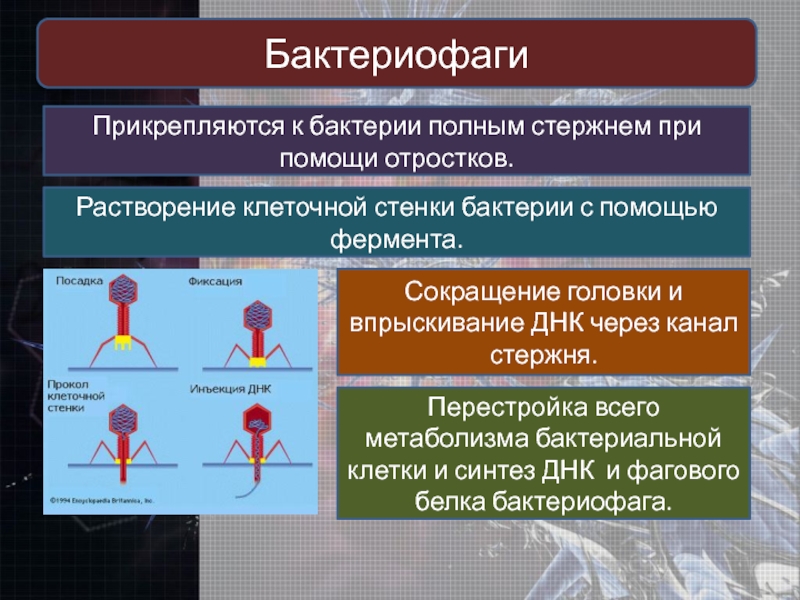Перестройка всего метаболизма бактериальной клетки и синтез ДНК и фагового белка бактериофага.