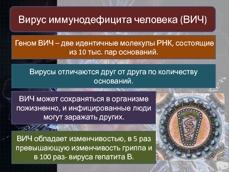ВИЧ обладает изменчивостью, в 5 раз превышающую изменчивость гриппа и в 100 раз- вируса гепатита В.