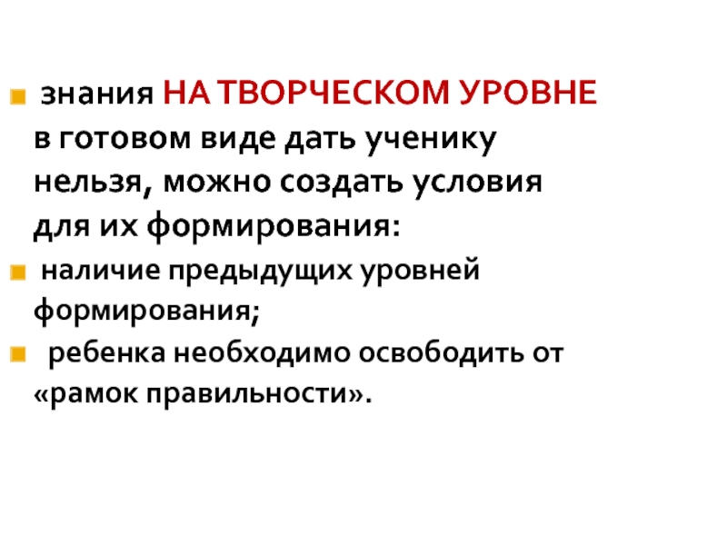 Слайд 24 знания НА ТВОРЧЕСКОМ УРОВНЕ в готовом виде дать ученику