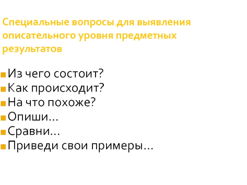 Слайд 20Специальные вопросы для выявления описательного уровня предметных результатов