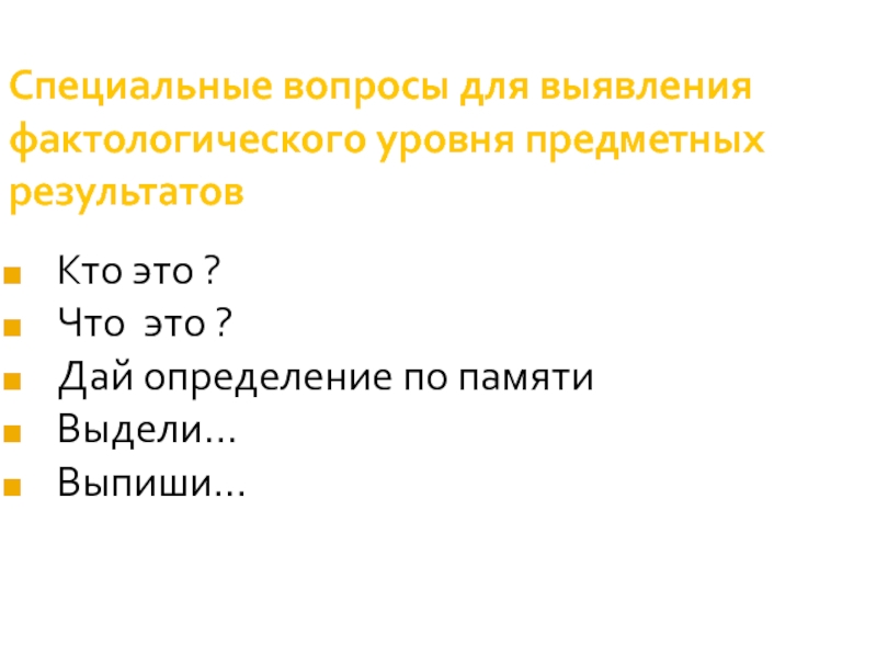 Слайд 18Специальные вопросы для выявления фактологического уровня предметных результатов