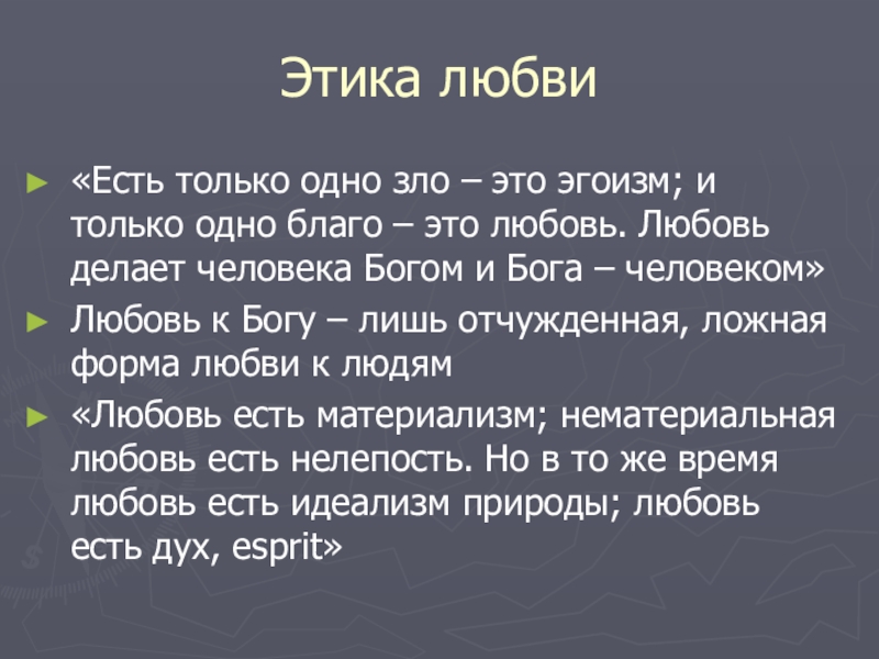 «Любовь есть материализм; нематериальная любовь есть нелепость. Но в то же время любовь есть идеализм природы; любовь есть дух, esprit»