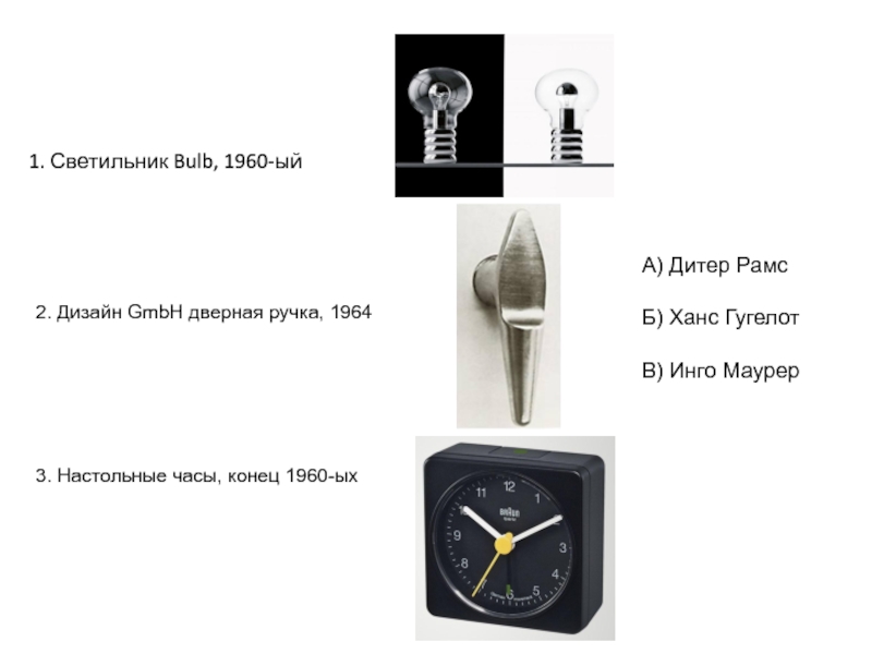 1. Светильник Bulb, 1960-ый2. Дизайн GmbH дверная ручка, 19643. Настольные часы, конец 1960-ых А) Дитер РамсБ) Ханс