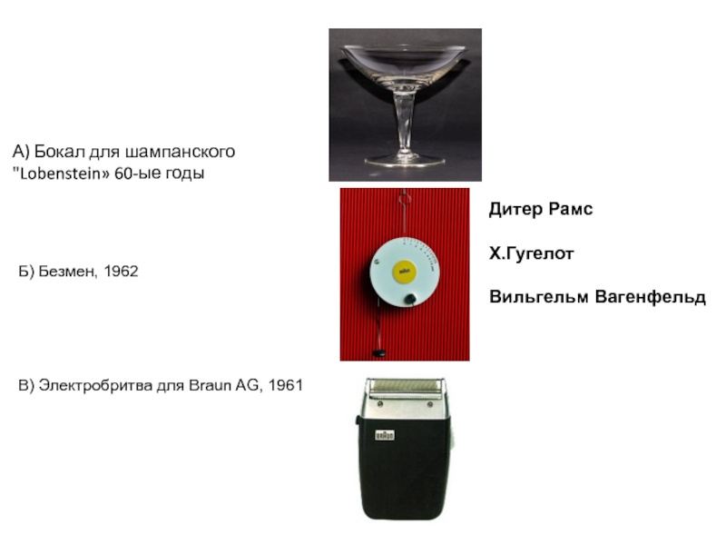 Б) Безмен, 1962В) Электробритва для Braun AG, 1961А) Бокал для шампанского