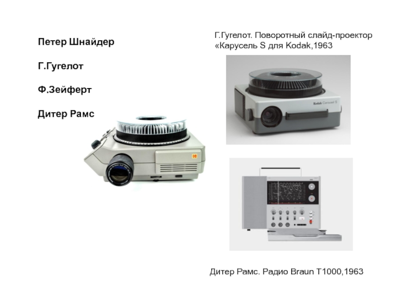 Г.Гугелот. Поворотный слайд-проектор «Карусель S для Kodak,1963Дитер Рамс. Радио Braun T1000,1963Петер ШнайдерГ.ГугелотФ.ЗейфертДитер Рамс