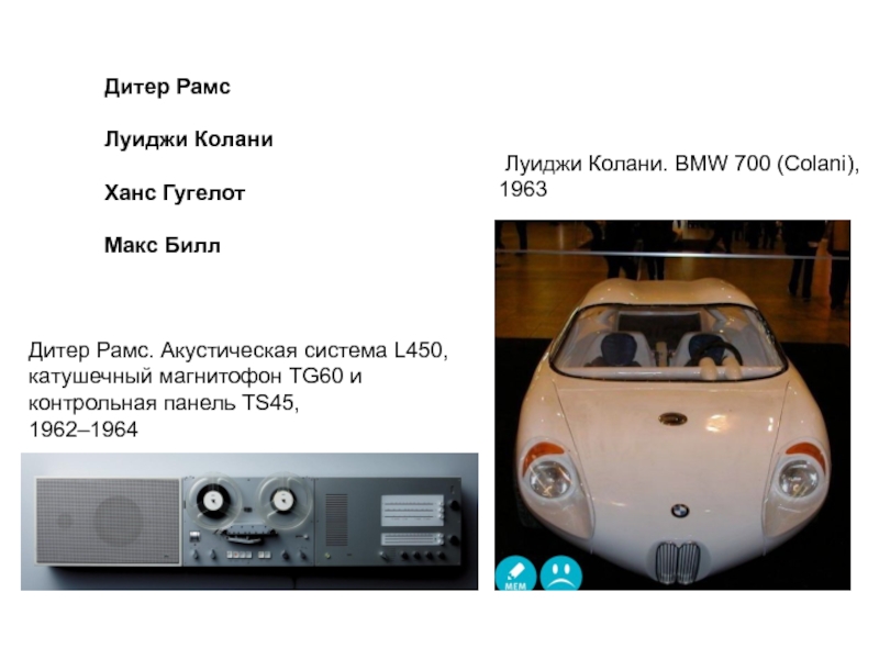 Дитер Рамс. Акустическая система L450, катушечный магнитофон TG60 и контрольная панель TS45, 1962–1964 Луиджи Колани. BMW 700 (Colani), 1963Дитер