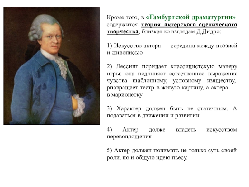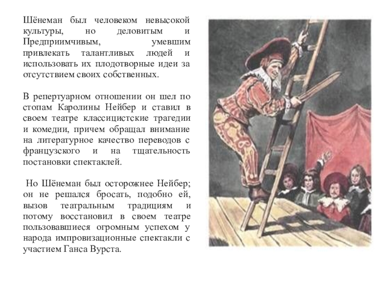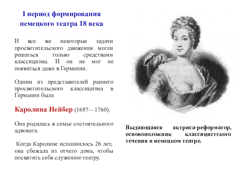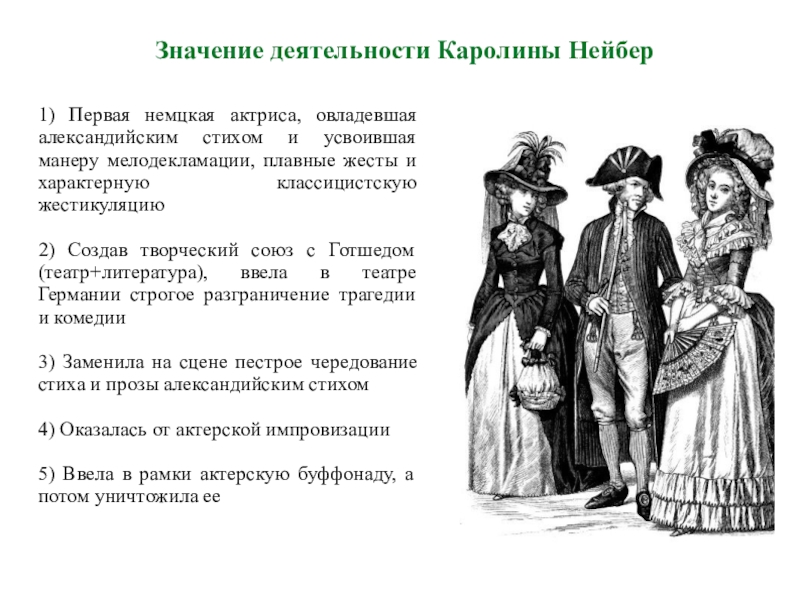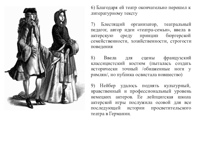 9) Нейбер удалось поднять культурный, нравственный и профессиональный уровень немецких актеров. Ее лейпцигская школа актерской игры послужила осовой для все последующей истории просветительского театра в Германии.