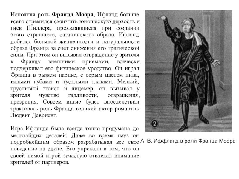 проявлявшиеся при создании этого страшного, сатанинского образа. Ифланд добился большой жизненности и натуральности образа Франца за счет снижения его трагической силы. При этом он вызывал отвращение у зрителя к Францу внешними приемами, всячески подчеркивал его физическое уродство. Он играл Франца в рыжем парике, с серым цветом лица, вялыми губами и тусклыми глазами. Мелкий, трусливый эгоист и лицемер, он вызывал у зрителя чувство гадливости, отвращения, презрения. Совсем иначе будет впоследствии трактовать роль Франца великий актер-романтик Людвиг Девриент.
