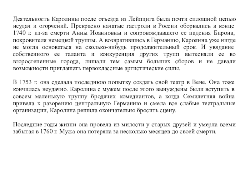 конце 1740 г. из-за смерти Анны Иоанновны и сопровождавшего ее падения Бирона, покровителя немецкой труппы. А возвратившись в Германию, Каролина уже нигде не могла основаться на сколько-нибудь продолжительный срок. И увядание собственного ее таланта и конкуренция других трупп вытесняли ее во второстепенные города, лишали тем самым больших сборов и не давали возможности приглашать первоклассные артистические силы.