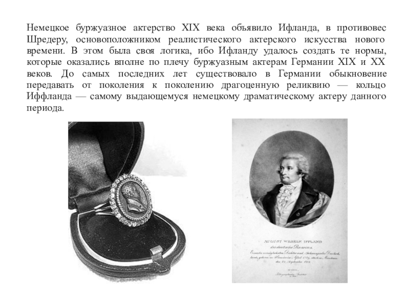 логика, ибо Ифланду удалось создать те нормы, которые оказались вполне по плечу буржуазным актерам Германии XIX и XX веков. До самых последних лет существовало в Германии обыкновение передавать от поколения к поколению драгоценную реликвию — кольцо Иффланда — самому выдающемуся немецкому драматическому актеру данного периода.