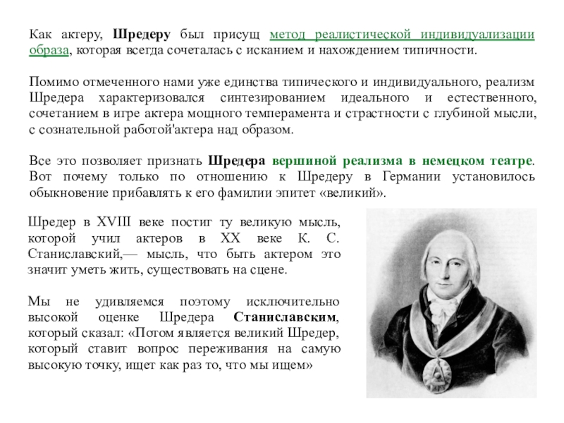 Шредер в XVIII веке постиг ту великую мысль, которой учил актеров в XX веке К. С. Станиславский,— мысль, что быть актером это значит уметь жить, существовать на сцене.