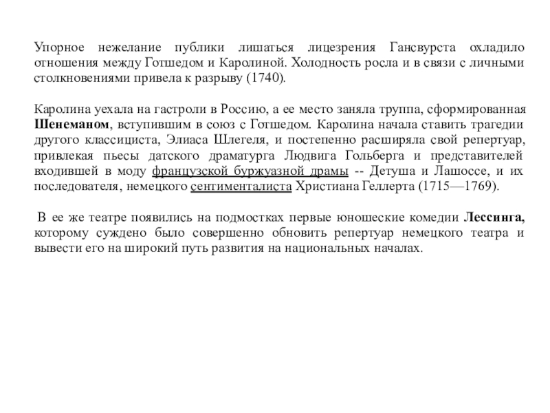 Каролина уехала на гастроли в Россию, а ее место заняла труппа, сформированная Шенеманом, вступившим в союз с Готшедом. Каролина начала ставить трагедии другого классициста, Элиаса Шлегеля, и постепенно расширяла свой репертуар, привлекая пьесы датского драматурга Людвига Гольберга и представителей входившей в моду французской буржуазной драмы -- Детуша и Лашоссе, и их последователя, немецкого сентименталиста Христиана Геллерта (1715—1769).