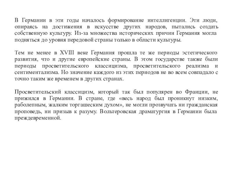 Просветительский классицизм, который так был популярен во Франции, не прижился в Германии. В стране, где «весь народ был проникнут низким, раболепным, жалким торгашеским духом», не могли прозвучать ни гражданская проповедь, ни призыв к разуму. Вольтеровская драматургия в Германии была преждевременной.