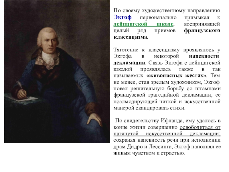 понимали его классицисты. Ифланд был против искусственных жестов и других условностей классицистского театра.