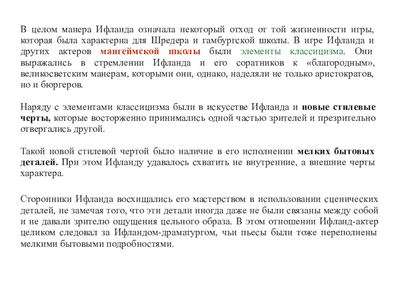 игре Ифланда и других актеров мангеймской школы были элементы классицизма. Они выражались в стремлении Ифланда и его соратников к «благородным», великосветским манерам, которыми они, однако, наделяли не только аристократов, но и бюргеров.