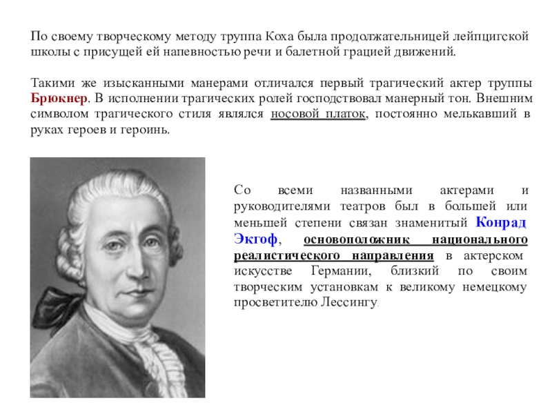 Если лейпцигская школа, созданная Каролиной Нейбер, была школой классицистских актеров, то гамбургская школа перенесла в область актерского искусства просветительский реализм Лессинга.