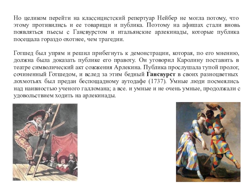 Готшед был упрям и решил прибегнуть к демонстрации, которая, по его мнению, должна была доказать публике его правоту. Он уговорил Каролину поставить в театре символический акт сожжения Арлекина. Публика прослушала тупой пролог, сочиненный Готшедом, и вслед за этим бедный Гансвурст в своих разноцветных лохмотьях был предан беспощадному аутодафе (1737). Умные люди посмеялись над наивностью ученого галломана; а все. и умные и не очень умные, продолжали с удовольствием ходить на арлекинады.