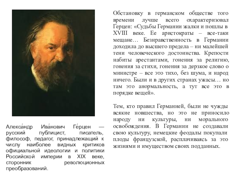 Слайд 4Обстановку в германском обществе того времени лучше всего охарактеризовал Герцен: