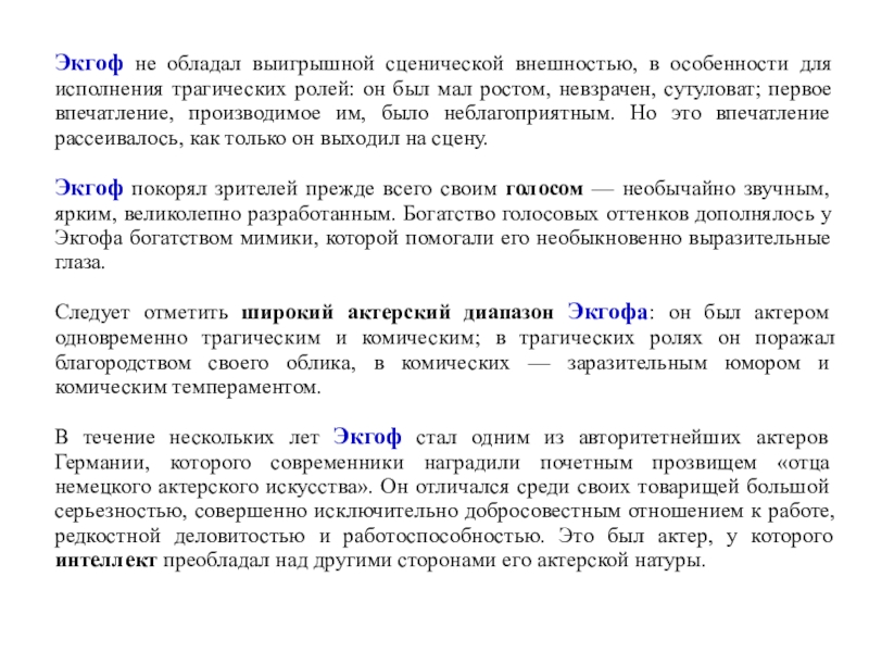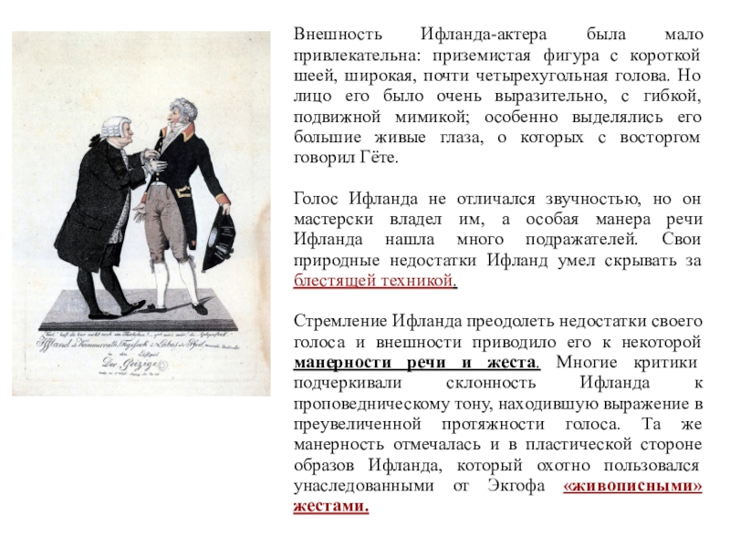 Слайд 69Внешность Ифланда-актера была мало привлекательна: приземистая фигура с короткой шеей,