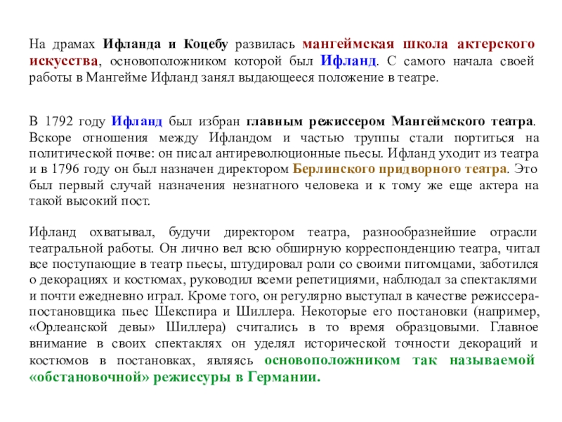с деятельностью актера и режиссера Ифланда, основоположника мангеймской школы.