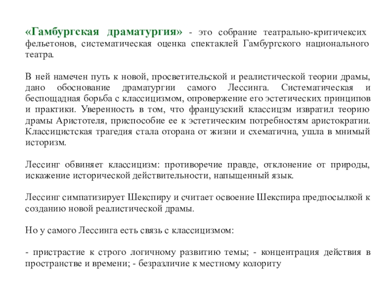 Он читал лекции по изящной словесности и доказывал своим слушателям и одновременно читателям издаваемого им журнала, что для немецкой драматургии единственное спасение -- идти на выучку к французскому классицизму.