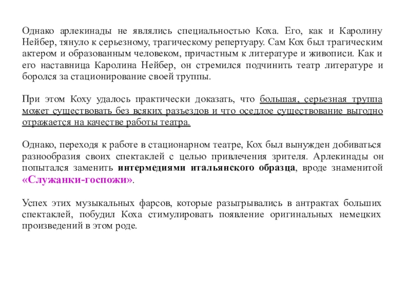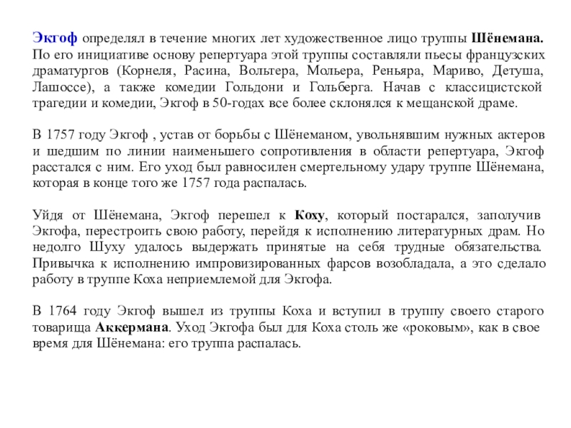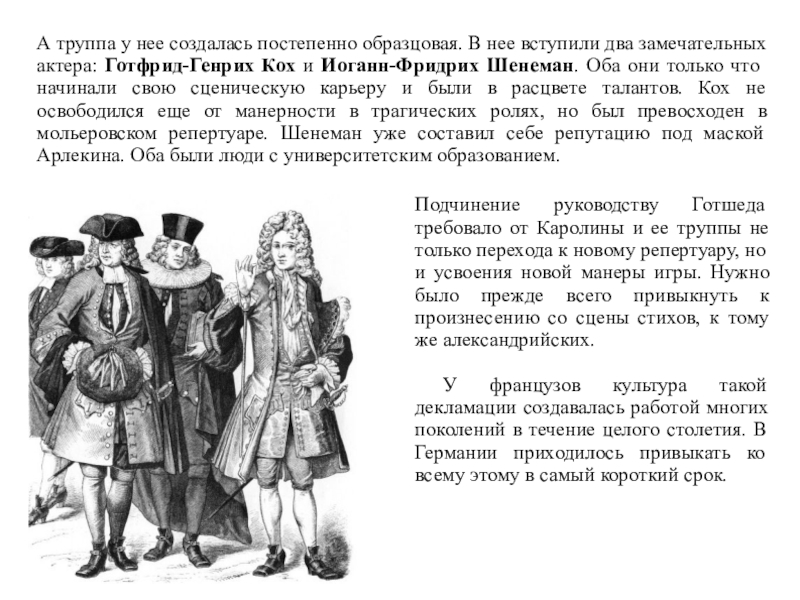 только что начинали свою сценическую карьеру и были в расцвете талантов. Кох не освободился еще от манерности в трагических ролях, но был превосходен в мольеровском репертуаре. Шенеман уже составил себе репутацию под маской Арлекина. Оба были люди с университетским образованием.