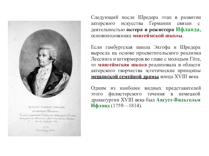 Слайд 67На драмах Ифланда и Коцебу развилась мангеймская школа актерского искусства,