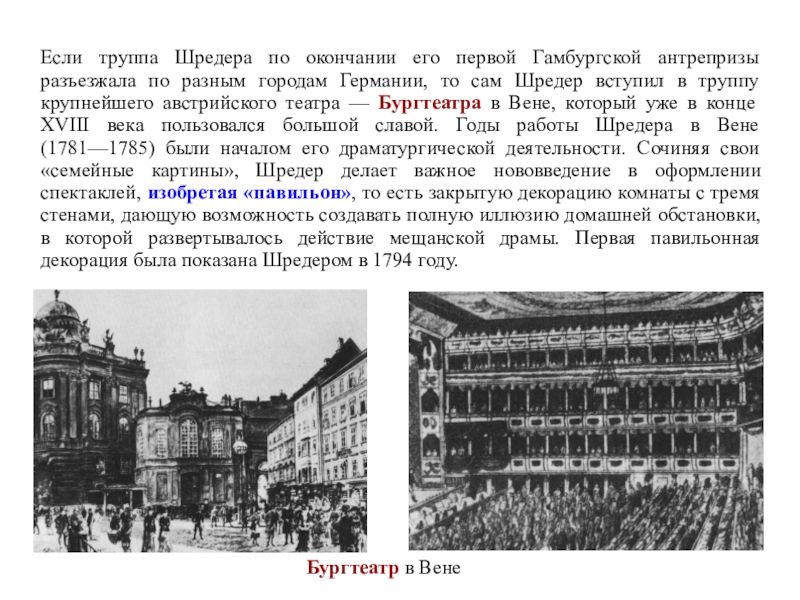 крупнейшего австрийского театра — Бургтеатра в Вене, который уже в конце XVIII века пользовался большой славой. Годы работы Шредера в Вене (1781—1785) были началом его драматургической деятельности. Сочиняя свои «семейные картины», Шредер делает важное нововведение в оформлении спектаклей, изобретая «павильон», то есть закрытую декорацию комнаты с тремя стенами, дающую возможность создавать полную иллюзию домашней обстановки, в которой развертывалось действие мещанской драмы. Первая павильонная декорация была показана Шредером в 1794 году.