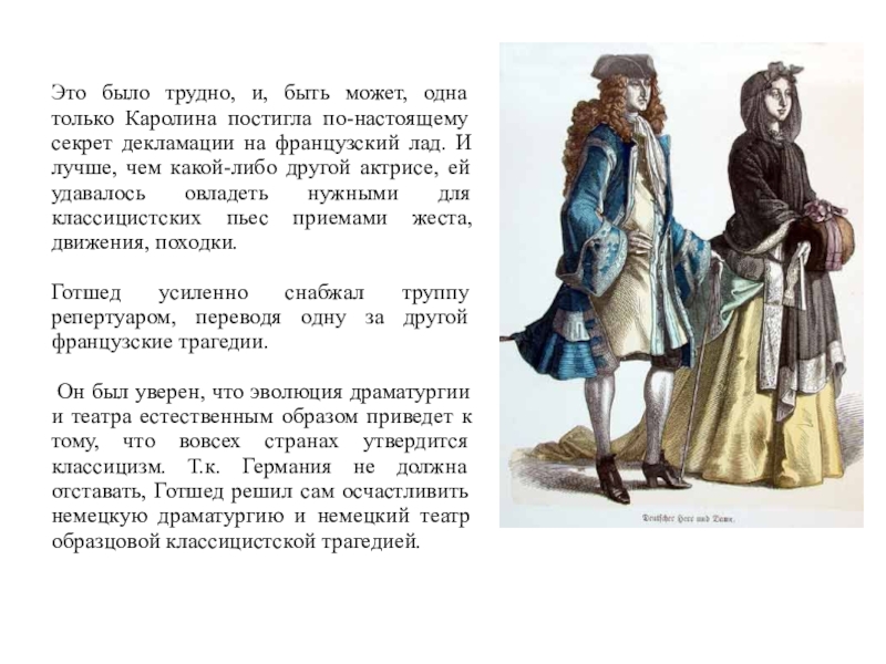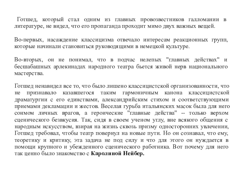 до Готшеда находила много здорового и нужного. После первых же бесед с Готшедом она целиком стала на его точку зрения. Как все ограниченные люди, Готшед был максималист, требовал, чтобы театр ничего не знал, кроме французского классицистского репертуара, чтобы с его подмостков было изгнано все, что напоминало старый репертуар. После некоторых колебаний Каролина отдала свой талант и свою труппу служению этой идее.