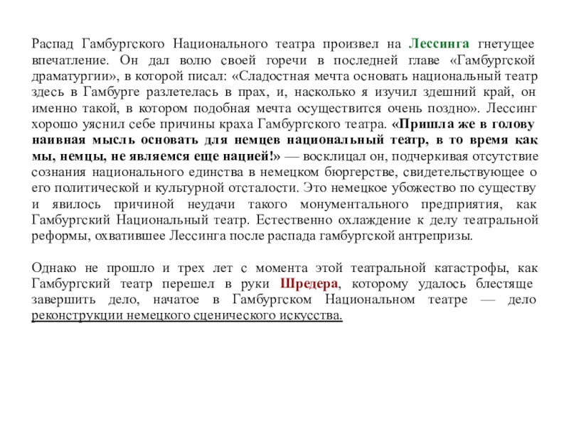 Все это позволяет признать Шредера вершиной реализма в немецком театре. Вот почему только по отношению к Шредеру в Германии установилось обыкновение прибавлять к его фамилии эпитет «великий».
