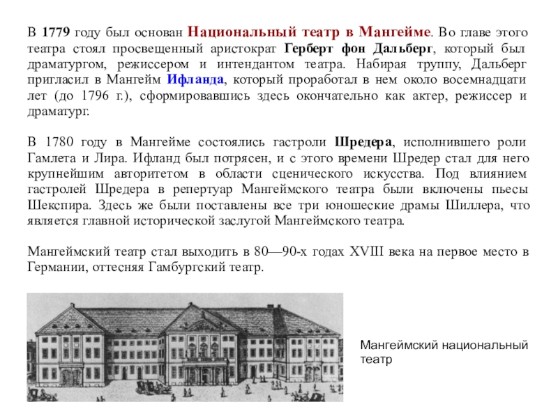 Слайд 65В 1779 году был основан Национальный театр в Мангейме. Во