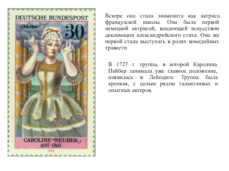 В 1727 г. труппа, в которой Каролина Нейбер занимала уже главное положение, появилась в Лейпциге. Труппа была крепкая, с целым рядом талантливых и опытных актеров.