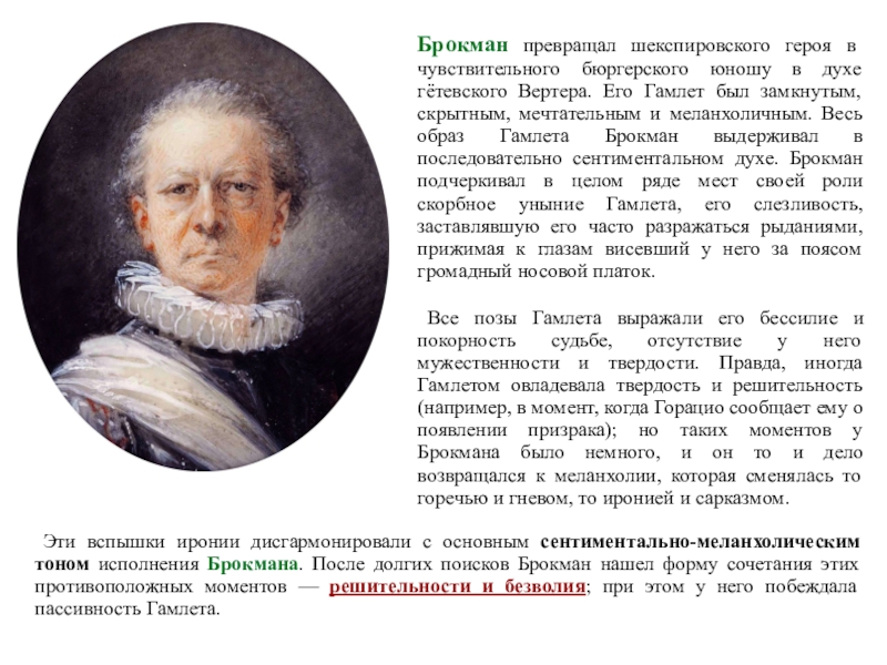 Эти вспышки иронии дисгармонировали с основным сентиментально-меланхолическим тоном исполнения Брокмана. После долгих поисков Брокман нашел форму сочетания этих противоположных моментов — решительности и безволия; при этом у него побеждала пассивность Гамлета.