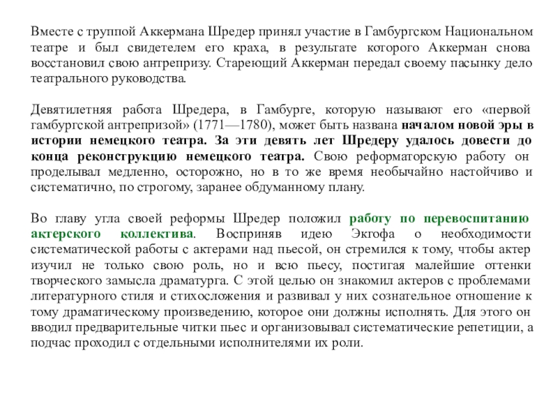 вместе с ним Шредер явился создателем гамбургской школы в немецком актерском искусстве, вдохновленной теоретическими высказываниями и драматургической практикой Лессинга.