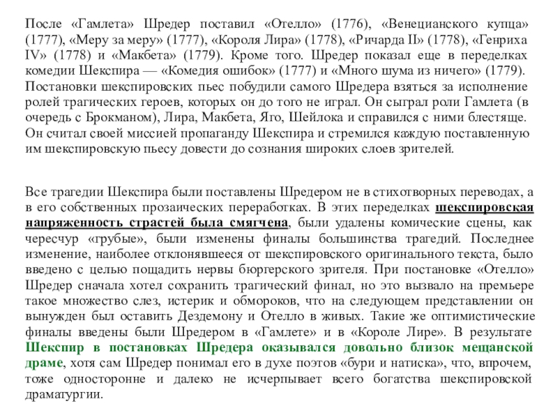 IV» (1778) и «Макбета» (1779). Кроме того. Шредер показал еще в переделках комедии Шекспира — «Комедия ошибок» (1777) и «Много шума из ничего» (1779). Постановки шекспировских пьес побудили самого Шредера взяться за исполнение ролей трагических героев, которых он до того не играл. Он сыграл роли Гамлета (в очередь с Брокманом), Лира, Макбета, Яго, Шейлока и справился с ними блестяще. Он считал своей миссией пропаганду Шекспира и стремился каждую поставленную им шекспировскую пьесу довести до сознания широких слоев зрителей.