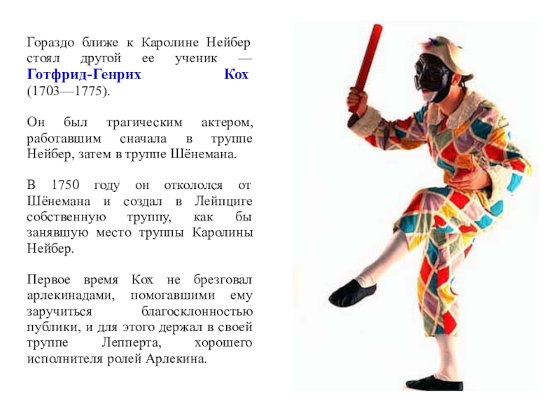 9) Нейбер удалось поднять культурный, нравственный и профессиональный уровень немецких актеров. Ее лейпцигская школа актерской игры послужила осовой для все последующей истории просветительского театра в Германии.