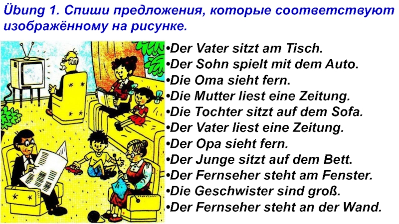 Слайд 4Übung 1. Спиши предложения, которые соответствуют изображённому на рисунке.