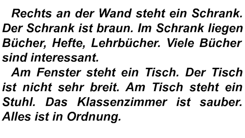In der Schule gibt es viele Klassenzimmer. Sie sind groß, hell und sauber. Unser Klassenzimmer ist nicht sehr groß. Hier stehen elf Tische und zweiundzwanzig Stühle. Rechts an der Tür stehen zwei Schränke. In den Schränken sind viele Bücher. Vorn an der Tafel hängt eine Karte.
