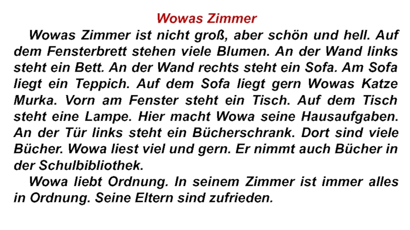 steht ein Bett. An der Wand rechts steht ein Sofa. Am Sofa liegt ein Teppich. Auf dem Sofa liegt gern Wowas Katze Murka. Vorn am Fenster steht ein Tisch. Auf dem Tisch steht eine Lampe. Hier macht Wowa seine Hausaufgaben. An der Tür links steht ein Bücherschrank. Dort sind viele Bücher. Wowa liest viel und gern. Er nimmt auch Bücher in der Schulbibliothek.
