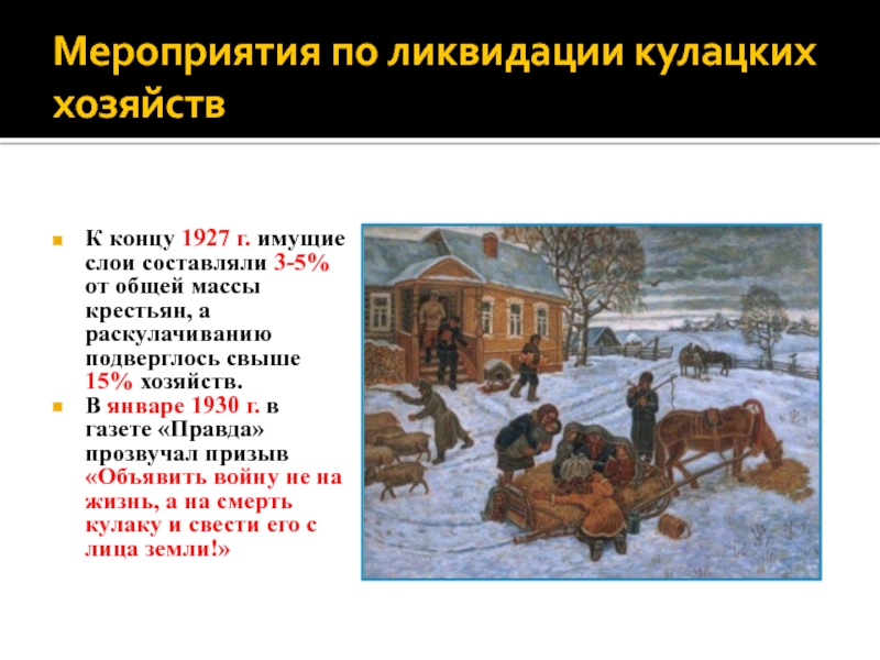 Слайд 29Мероприятия по ликвидации кулацких хозяйств