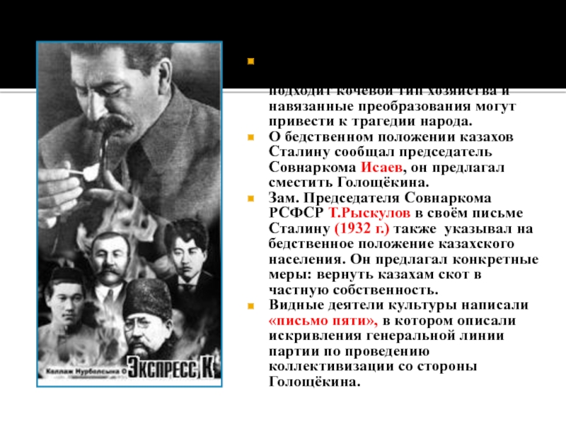 Видные деятели культуры написали «письмо пяти», в котором описали искривления генеральной линии партии по проведению коллективизации со стороны Голощёкина.