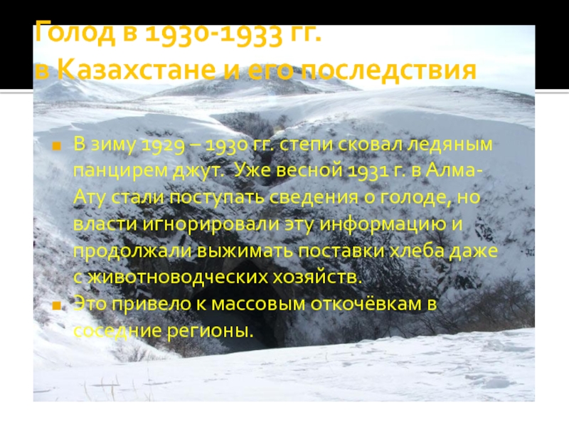1929 – 1930 гг. степи сковал ледяным панцирем джут. Уже