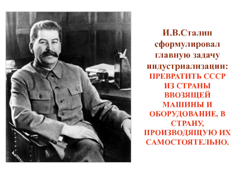 Слайд 25И.В.Сталин сформулировал главную задачу индустриализации: ПРЕВРАТИТЬ СССР ИЗ СТРАНЫ ВВОЗЯЩЕЙ