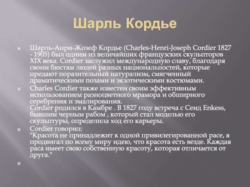 благодаря своим бюстам людей разных национальностей, которые предают поразительный натурализм, смягченный драматическими позами и экзотическими костюмами.Charles Cordier также известен своим эффективным использованием разноцветного мрамора и обширного серебрения и эмалирования. Cordier родился в Камбре . В 1827 году встреча с Сеид Enkess, бывшим черным рабом , который стал моделью его скульптуры, определила ход его карьеры.