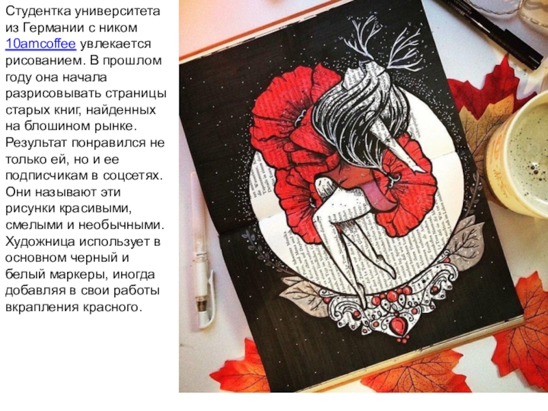 Слайд 31Студентка университета из Германии с ником 10amcoffee увлекается рисованием. В