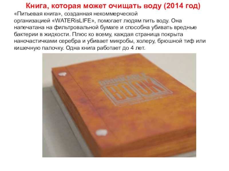 Слайд 10Книга, которая может очищать воду (2014 год)