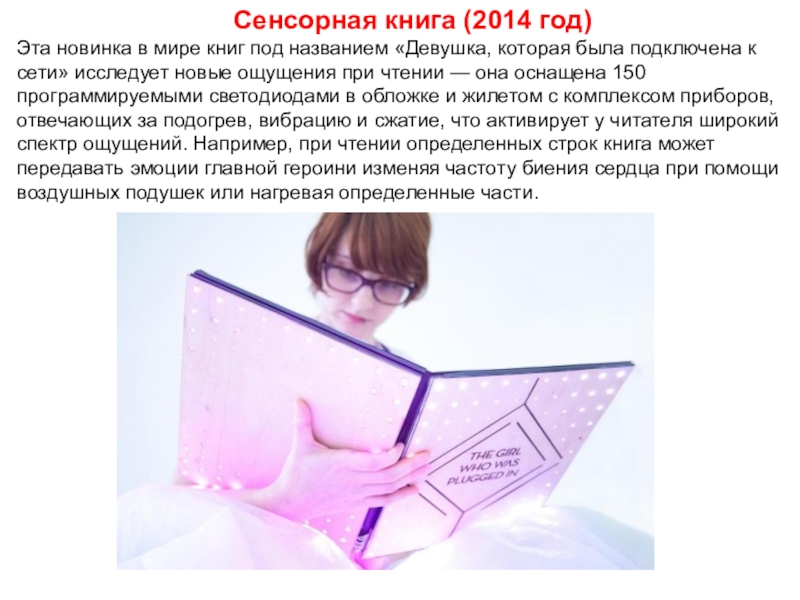 чтении — она оснащена 150 программируемыми светодиодами в обложке и жилетом с комплексом приборов, отвечающих за подогрев, вибрацию и сжатие, что активирует у читателя широкий спектр ощущений. Например, при чтении определенных строк книга может передавать эмоции главной героини изменяя частоту биения сердца при помощи воздушных подушек или нагревая определенные части.