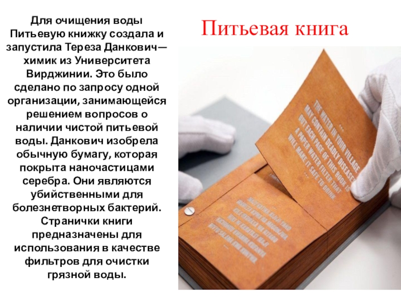 организации, занимающейся решением вопросов о наличии чистой питьевой воды. Данкович изобрела обычную бумагу, которая покрыта наночастицами серебра. Они являются убийственными для болезнетворных бактерий. Странички книги предназначены для использования в качестве фильтров для очистки грязной воды.